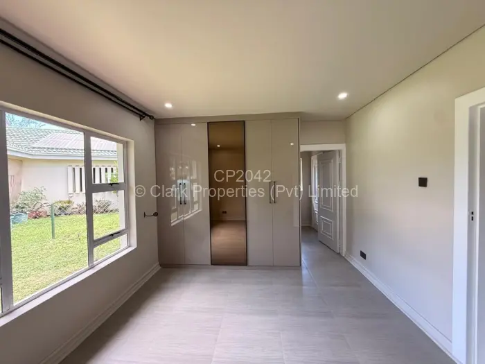 The modern kitchen comes fully equipped with a dishwasher, washing machine, built-in oven, a four-plate gas stove and an additional two-plate electric stove for versatile cooking. A separate courtyard with a washing line and basin provides convenience for household chores. The home is supported by an 8kVA solar system with batteries, a 2,500L water tank, one solar geyser, one electric geyser and a pre-paid ZESA meter for reliable utilities.