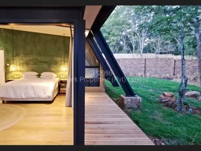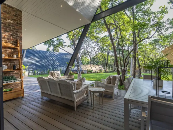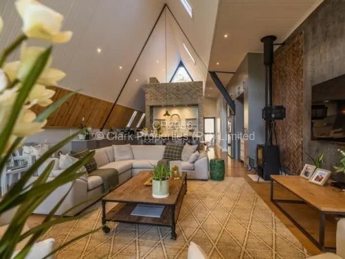 Clark Properties proudly presents this contemporary residence, set within an exclusive complex of eight units. The home features an open-plan dining, lounge, and kitchen area, fitted with a five-plate gas stove and oven, as well as a scullery and utility yard. The lounge includes a small bar area and opens outside, blending interior elegance with the beauty of the garden and veranda.