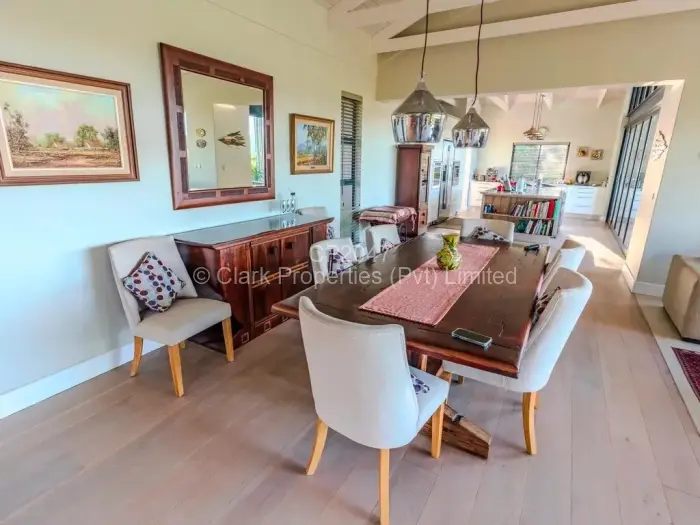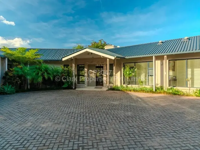 A contemporary Zimbabwean-style home under heavy-gauge Chromadek, designed by Bruce Rowlands and constructed by a UK Chartered Builder and Chartered Surveyor. The house features tiled, carpeted, and French oak wooden flooring and is set on an elevated site offering expansive views of the golf course and Domboshawa (Gomo Kurira). It is just a few minutes walk to the Golf and Country Clubhouse. This property ticks all the boxes in terms of security, style, and comfort. Sitting on approximately 3,605 m, the large stand also offers potential for further development.