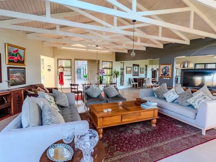 The large contemporary-style kitchen (Easy-Life designed and fitted) includes all Whirlpool appliances: built-in electric oven and microwave with warming drawer, gas hob, independent fridge and freezer, and a large feature center island topped with Colonial Stone. Caesarstone surfaces and two under-counter bar fridges complete the setup, with easy access to the patio through the wide folding-door system. A large scullery leads from the kitchen, offering extensive cupboard and storage space, and is fitted with Whirlpool washing, drying, and dishwashing equipment. This area leads to outside access and the staff quarters.