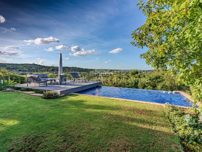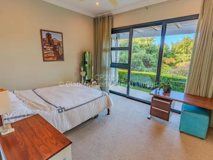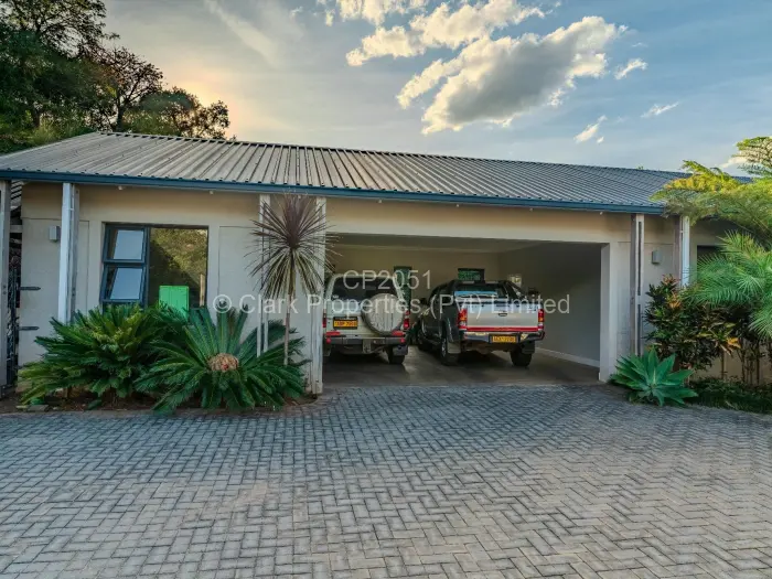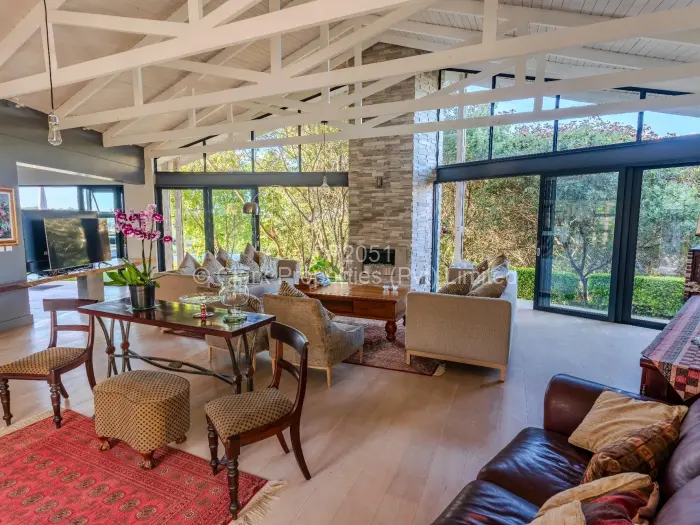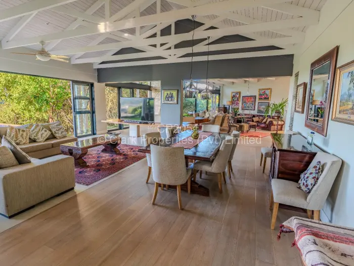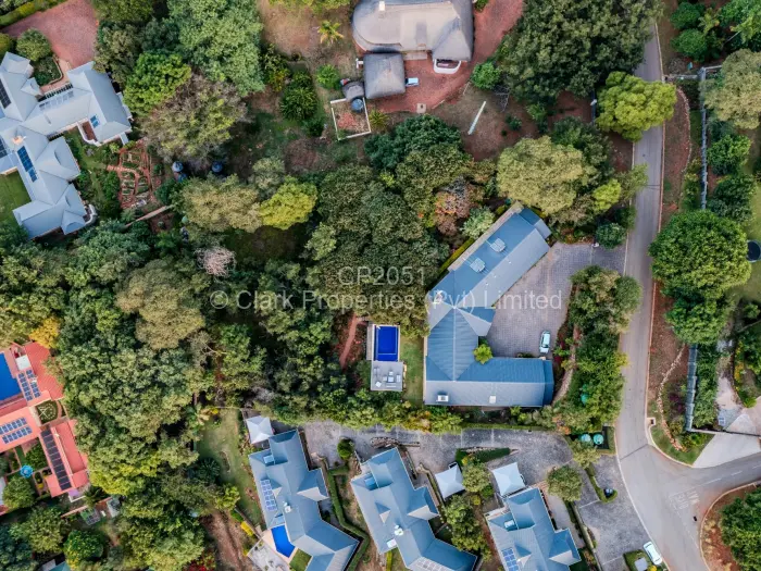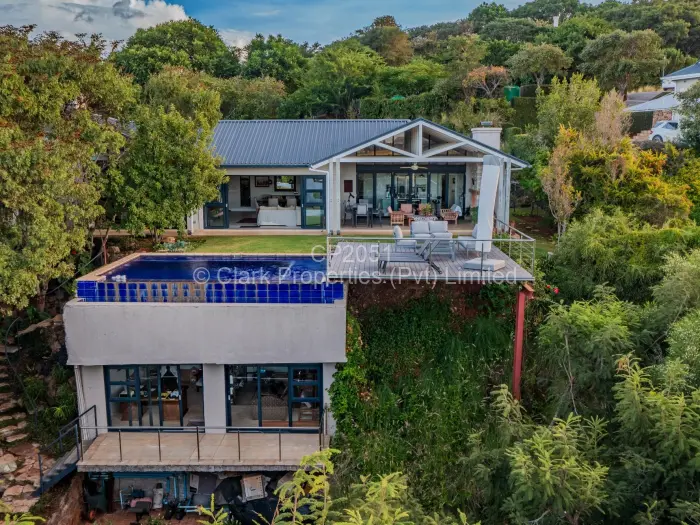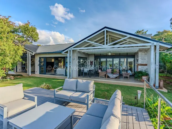 A contemporary Zimbabwean-style home under heavy-gauge Chromadek, designed by Bruce Rowlands and constructed by a UK Chartered Builder and Chartered Surveyor. The house features tiled, carpeted, and French oak wooden flooring and is set on an elevated site offering expansive views of the golf course and Domboshawa (Gomo Kurira). It is just a few minutes walk to the Golf and Country Clubhouse. This property ticks all the boxes in terms of security, style, and comfort. Sitting on approximately 3,605 m, the large stand also offers potential for further development.