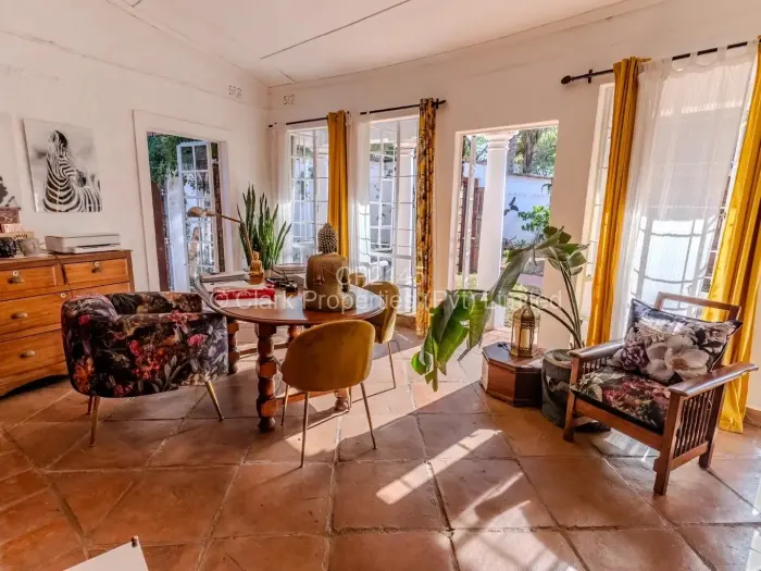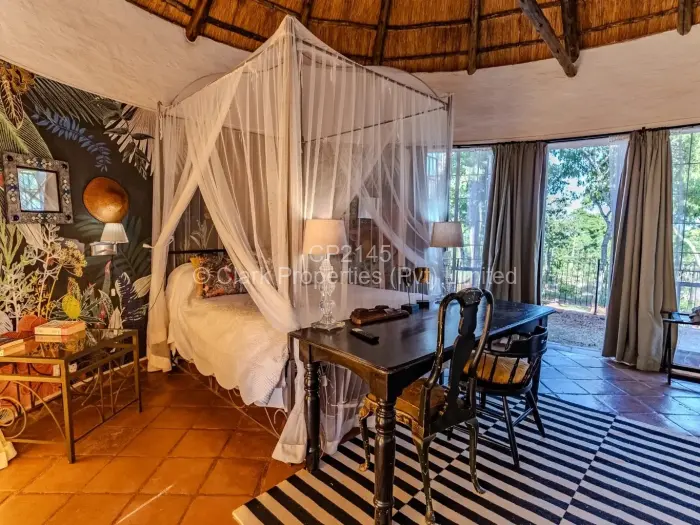 Entertainment spaces include two adjacent lounges, a grand dining room, a bar/games room, and a library. The kitchen and scullery are both spacious and ideal for catering purposes, and there is an office and guest toilet in this wing of the house. The bedroom wing has six bedrooms and six bathrooms, all en suite with private patios off each to take in the view. The master room has a private study, walk-in dressing room, and its own courtyard. The two end bedrooms have a shared lounge/kitchenette. The unusual yet clever design of the building allows for all the rooms and even the bathrooms to benefit from the views of the Shawasha countryside. A swimming pool is nestled in a courtyard with an entertainment gazebo, an ideal hideaway for relaxing.